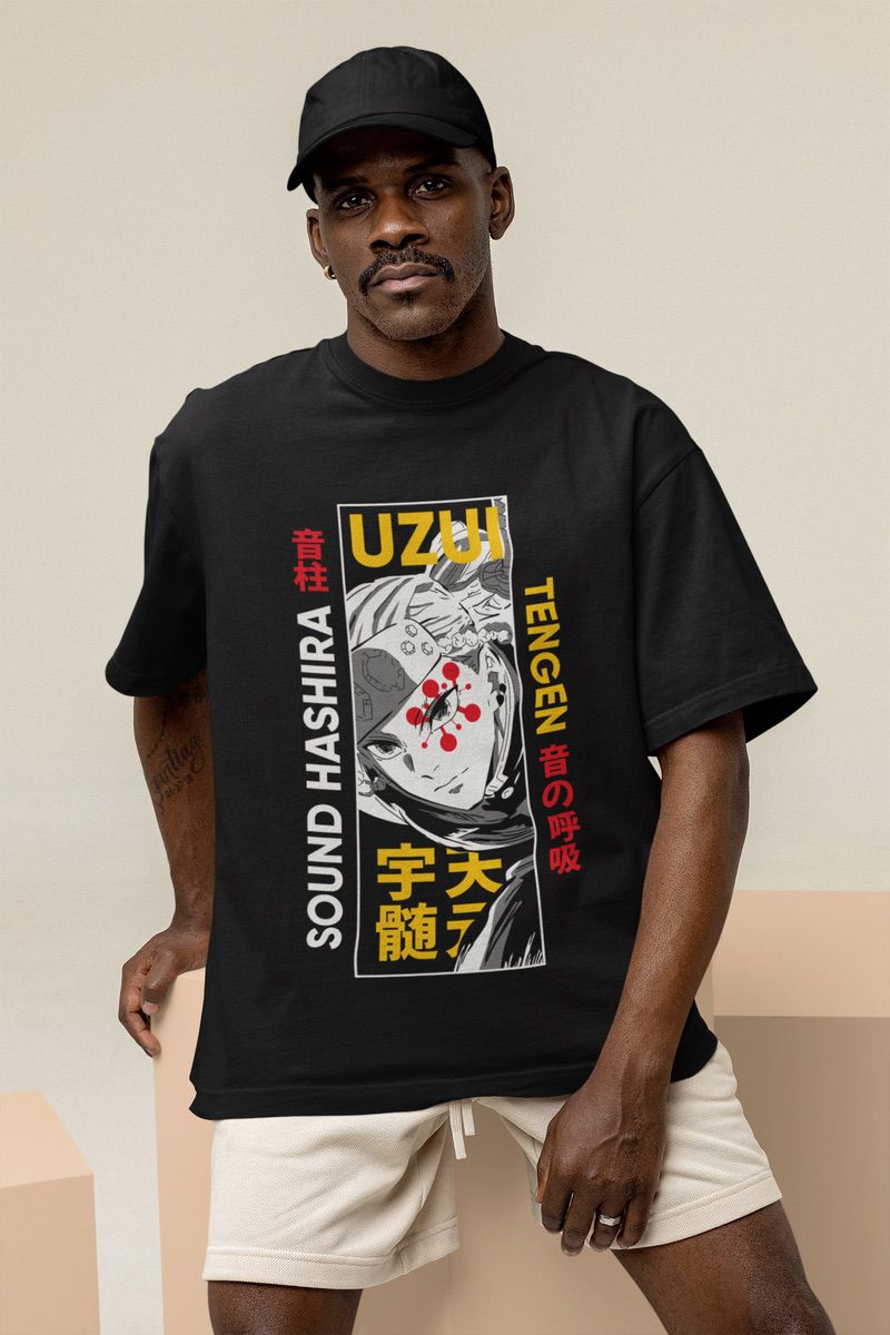 Shine with flair and power with this bold Tengen Uzui T-shirt! The flamboyant Sound Hashira, known for his explosive personality and unmatched combat skills, comes to life in this dynamic design. With his dual Nichirin Cleavers and vibrant accessories, Tengen embodies style, strength, and a larger-than-life presence that fans of Demon Slayer adore.